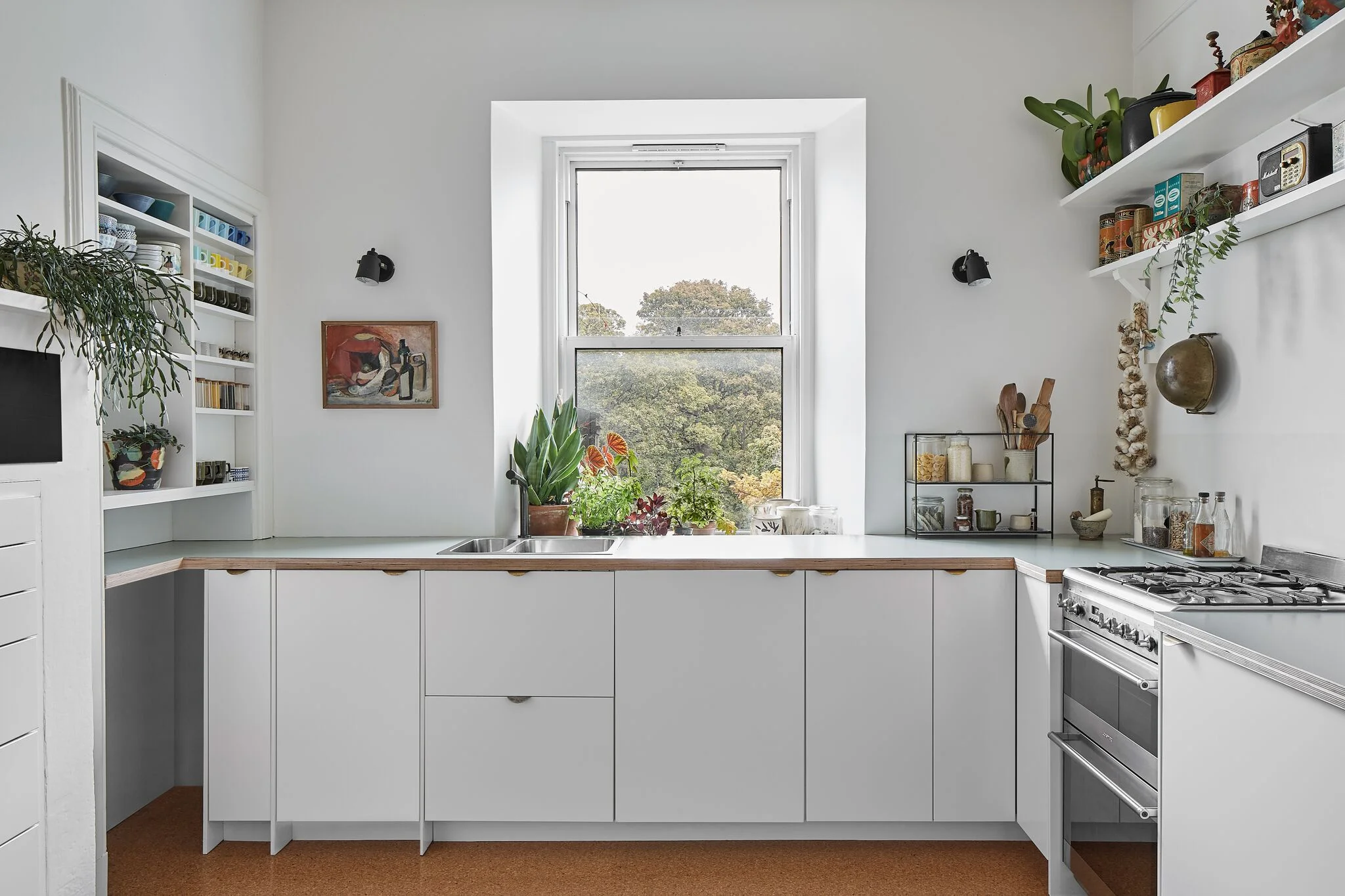 The brief was to create a well functioning kitchen fit for busy family life. Prior to refurbishment the room was cluttered and dysfunctional, with very limited storage or worktop space and appliances and shelves sat in front of the fireplace and press. Now the period features have been adapted to become a functional part of the kitchen. Full depth drawers sitting into the fireplace, and shelves have been built into the Edinburgh press. There is plenty of worktop space, allowing for preparation of large family meals. The clean palette of whites, cork, and plywood fits in harmoniously and unassumingly with the period features of the room and allows the many beautiful objects of the owners to be displayed proudly without the room feeling cluttered.